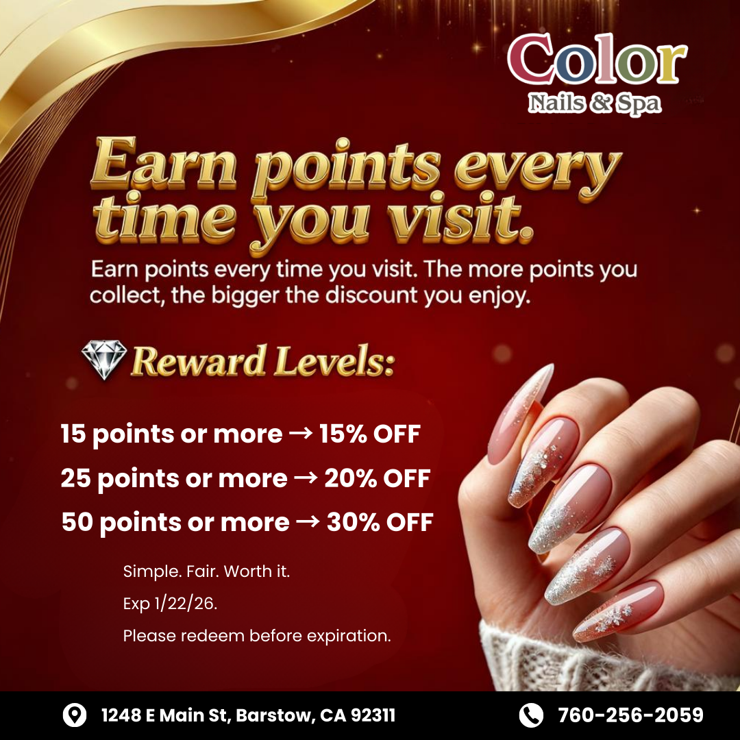 Located conveniently in Barstow, California 92311, Color Nails & Spa has become a top-notch nail salon here as we always focus on customer safety, needs, and satisfaction. Our priorities are client-focused services, high-quality products, and above all else, grade-A sanitation standards.